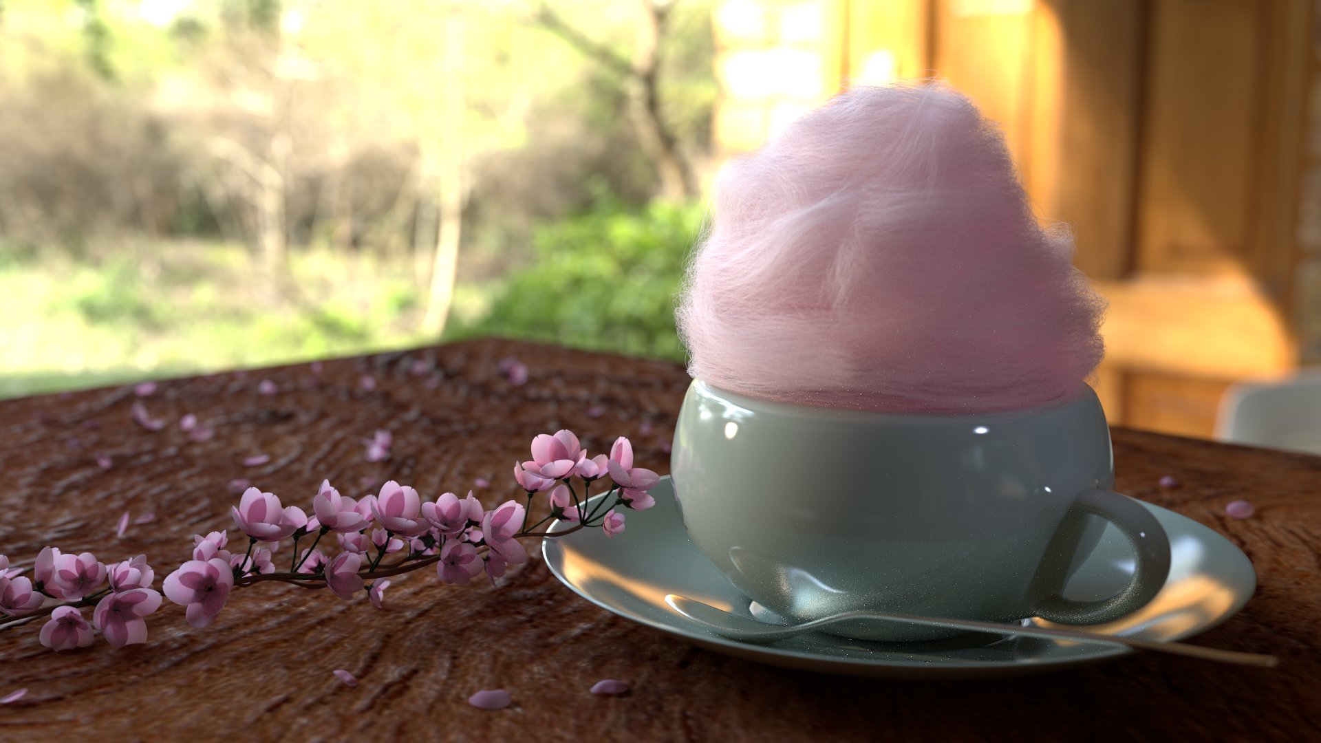 图 1.15: 陈林孟、霍伯特·张和志仁·朱渲染了这张看起来美味的棉花糖在茶杯中的图像,以赢得 2018 年斯坦福 CS348b 渲染比赛的大奖。他们使用多层曲线建模棉花糖,然后在中心填充参与介质,以高效地模拟其内部的散射。